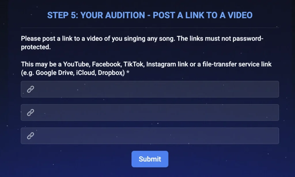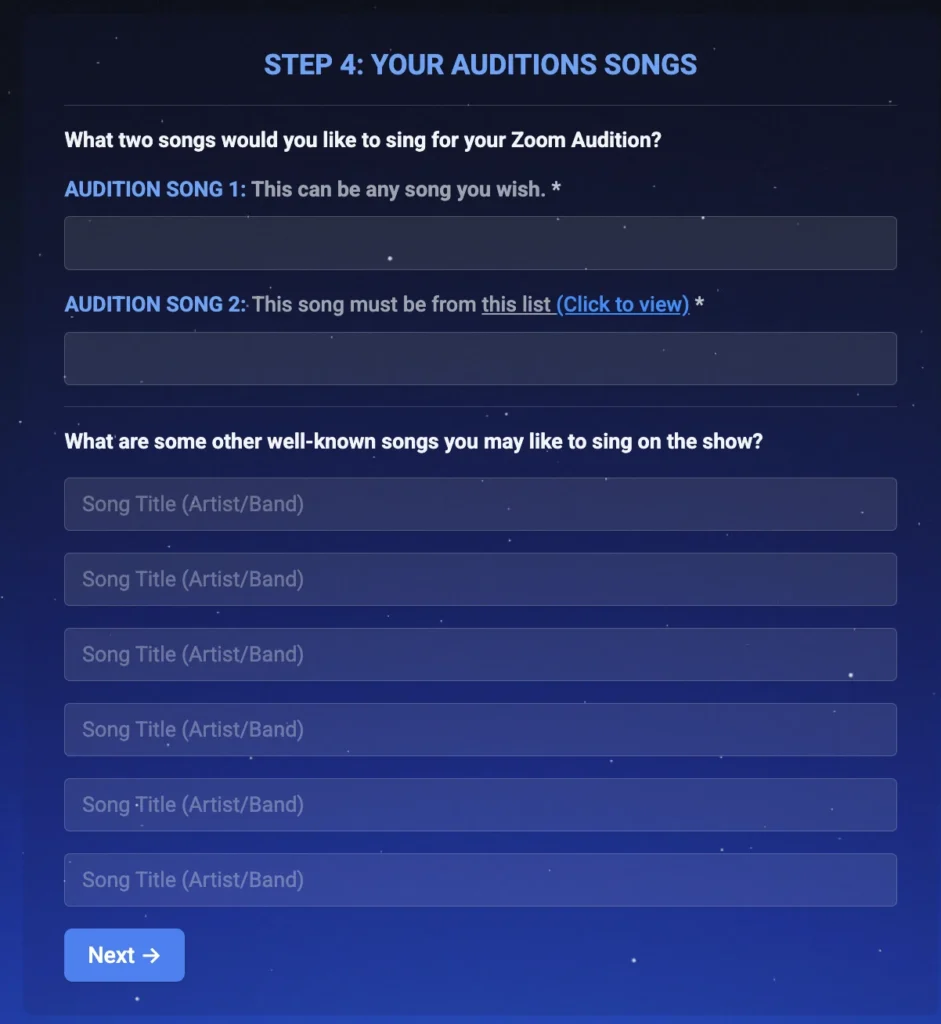 - Previous TV show auditions: If you’ve auditioned for other reality or singing shows, mention when, which shows, and how far you progressed.